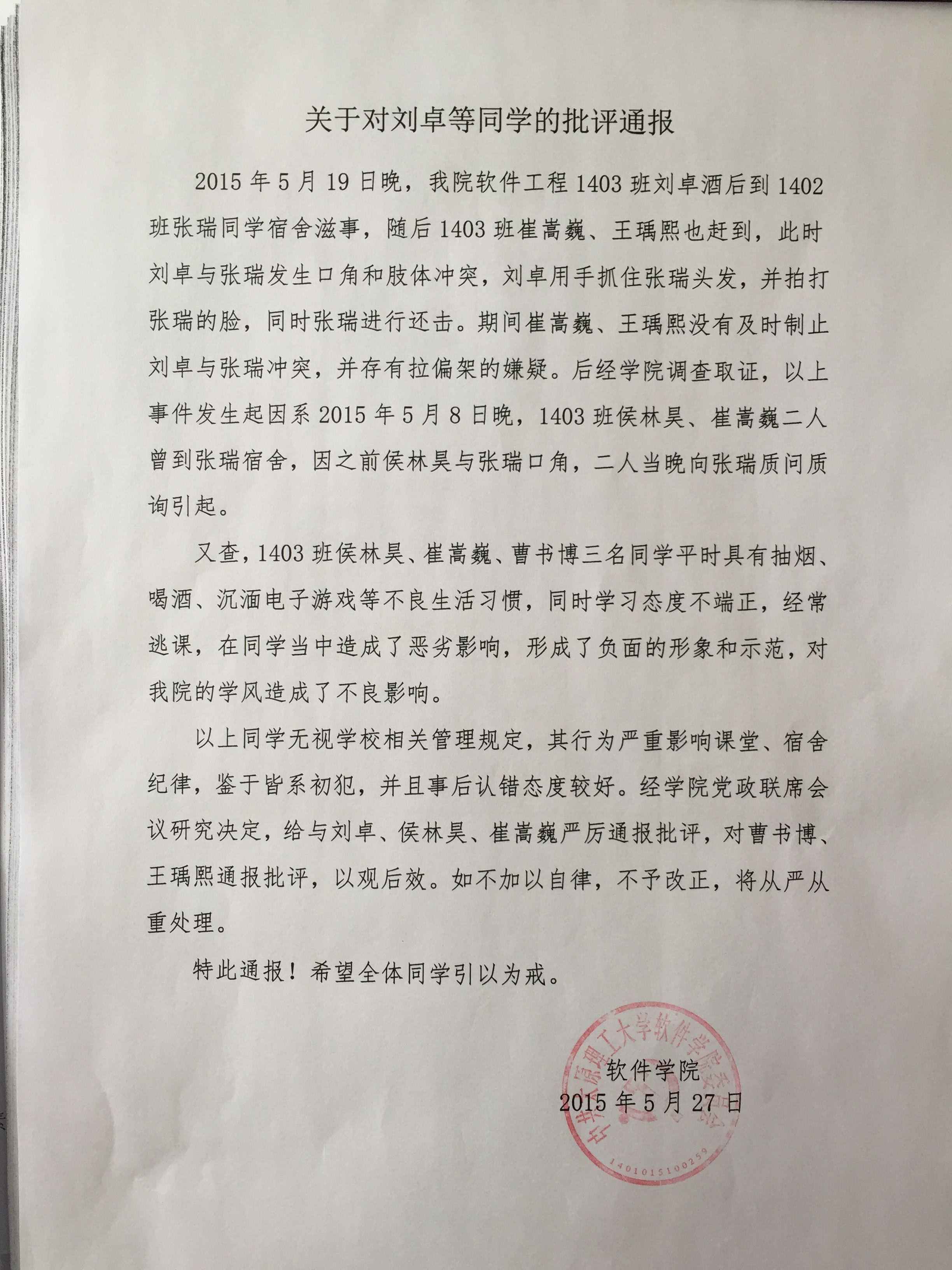 2015年5月19日晚,我院软件工程1403班刘卓酒后到1402班张瑞同学宿舍滋事,随后1403班崔嵩巍、王瑀熙也赶到,此时刘卓与张瑞发生口角和肢体冲突,刘卓用手抓住张瑞头发,并拍打张瑞的脸,同时张瑞进行还击。期间崔嵩巍、王瑀熙没有及时制止刘卓与张瑞冲突,并存有拉偏架的嫌疑。后经学院调查取证,以上事件发生起因系2015年5月8日晚,1403班侯林昊、崔嵩巍二人曾到张瑞宿舍,因之前侯林昊与张瑞口角,二人当晚向张瑞质问质询引起。