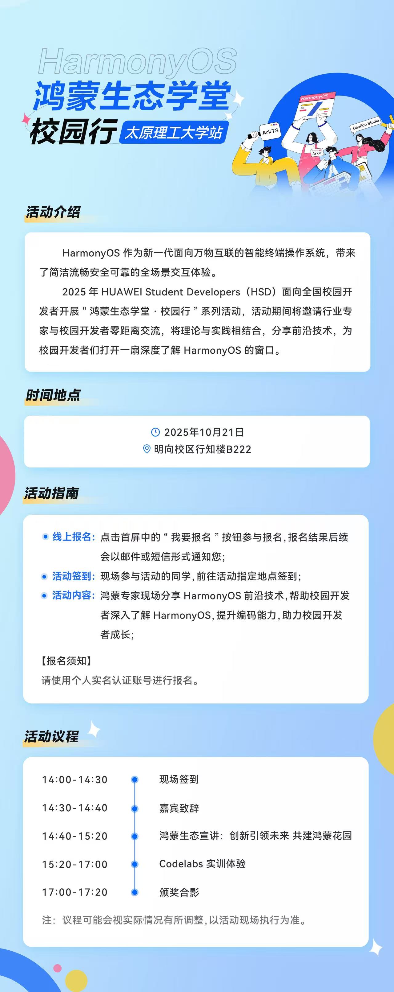 以热爱之名,燃青春之火。华为鸿蒙HSD于10月21日在yl23411永利明向校区举办校园行活动,届时华为专家将为大家带来鸿蒙生态议题宣讲和codelabs实训体验,希望大家踊跃报名!