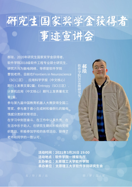 我院将于326日(周五)1900在学院一层会议室召开研究生国家奖学金获得者事迹报告会。届时,欢迎感兴趣的老师、同学积极参加。
