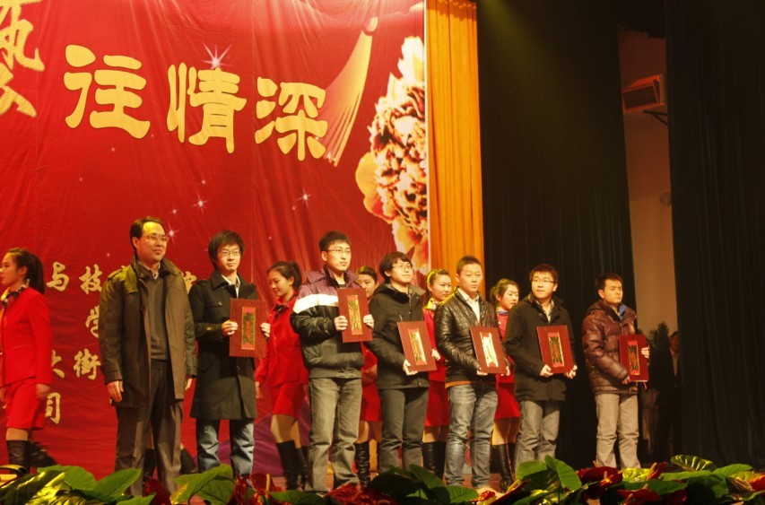 晚会期间,学院还分别对优秀学生干部、三好学生和先进班集体进行了表彰,并由学院党政负责人为他们颁发了荣誉证书。此外,院科学技术协会兴趣小组部分成员作为代表,为兴趣小组的各位指导老师献上鲜花并颁发了聘书,以此来表示对老师们的感谢和祝福。