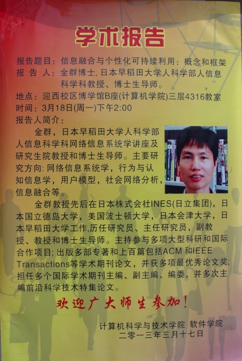 3月18日下午,计算机科学与技术学院、永利yl23411集团邀请日本早稻田大学教授、我校客座教授金群博士在博学馆B座4316教室做了题为《信息融合与个性化可持续利用:概念和框架》的专题学术讲座。讲座由学院陈俊杰院长主持,学院部分教师、研究生以及本科生代表听取了报告。