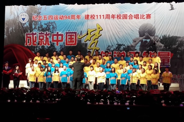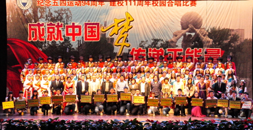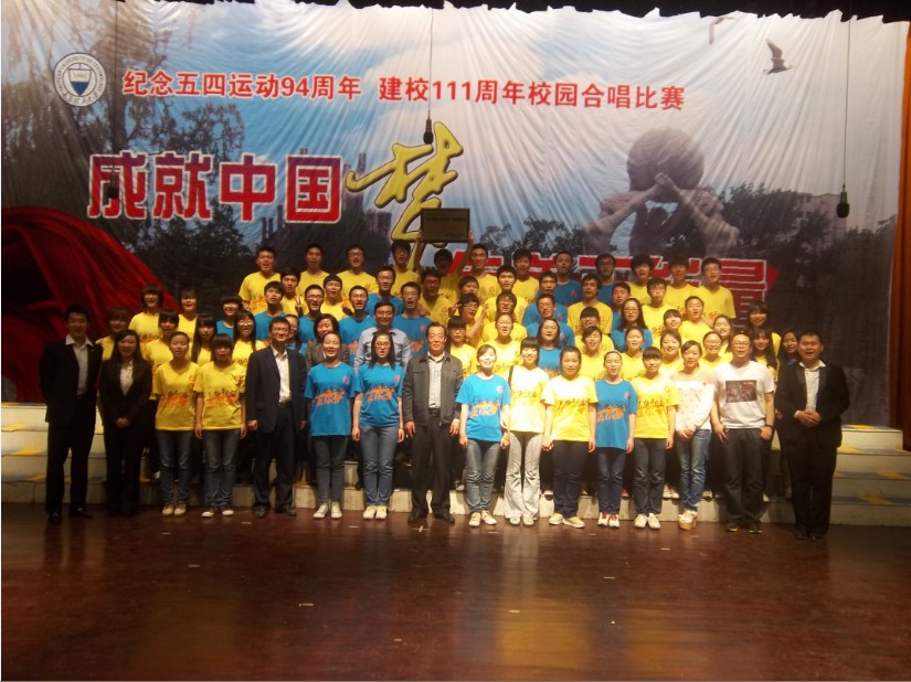 5月6日晚,我校纪念五四运动94周年、建校111周年“成就中国梦 传递正能量”校园合唱比赛在虎峪校区同泽会堂举行。校党委书记吴俊清,校长吕明,校党委副书记安川金、张惠元,副校长梁丽萍应邀出席。各党政职能部门、各学院负责人与全校近千名师生一同观看了比赛。