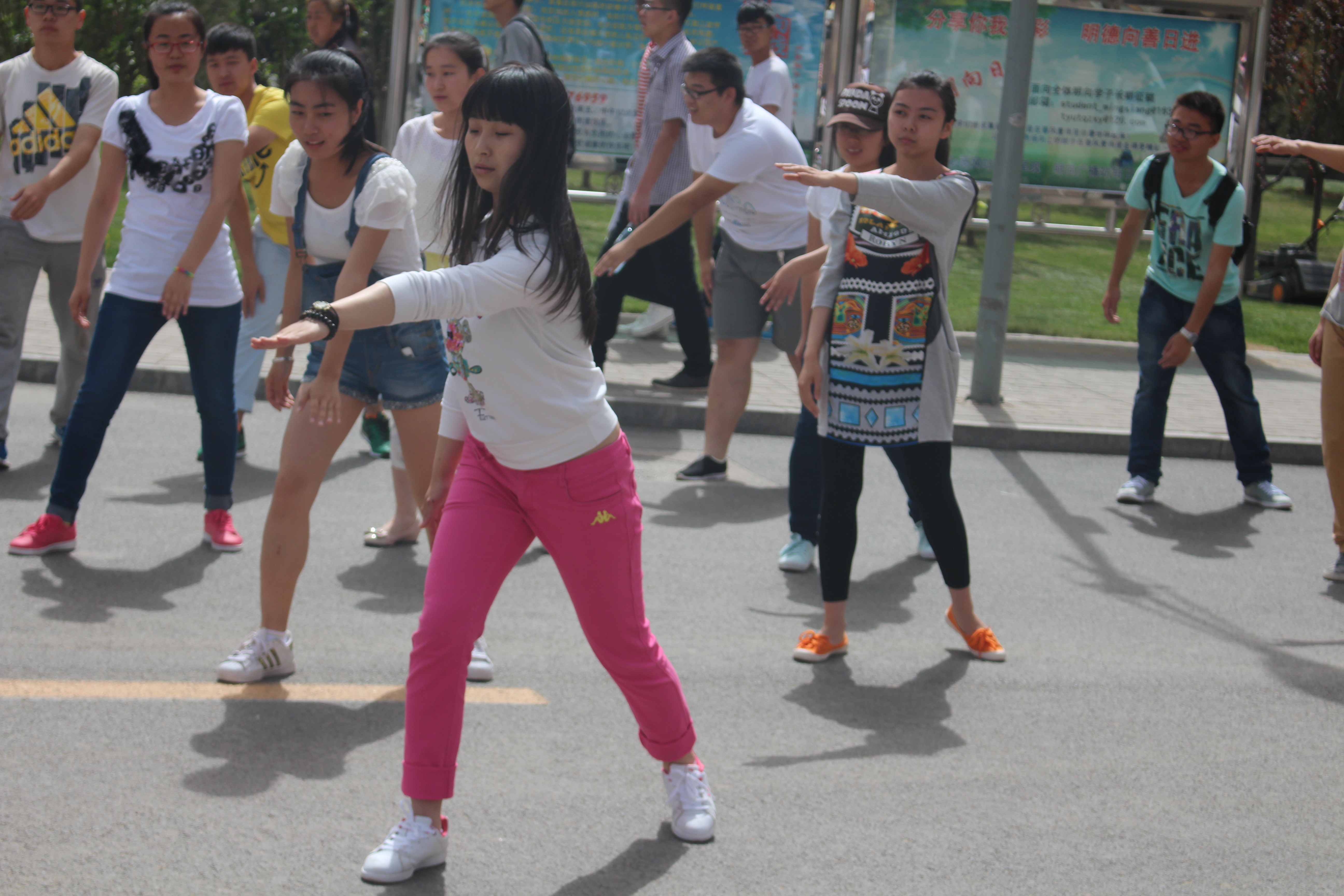 上午第二节课后,同学们一如既往的穿梭在教学楼间,随着《全国第二套中小学生广播体操》音乐的响起,人群中从四面八方涌出快闪队员。他们迅速站好队形,在轻松而舒缓的音律中,伸展、跳跃,认真而整齐的做好每一个动作。各式各样的装扮和各种酷炫的舞蹈动作引来不少老师、同学驻足观赏。熟悉的旋律、优美的动作、新颖的活动形式吸引大家纷纷拍照、录像。