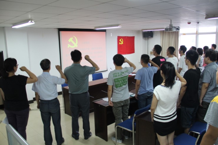 大会在雄壮的《国际歌》中开始。面对鲜艳的党旗,院党委副书记池卫平带领新党员宣誓,参会的全体老党员重温了入党誓词。