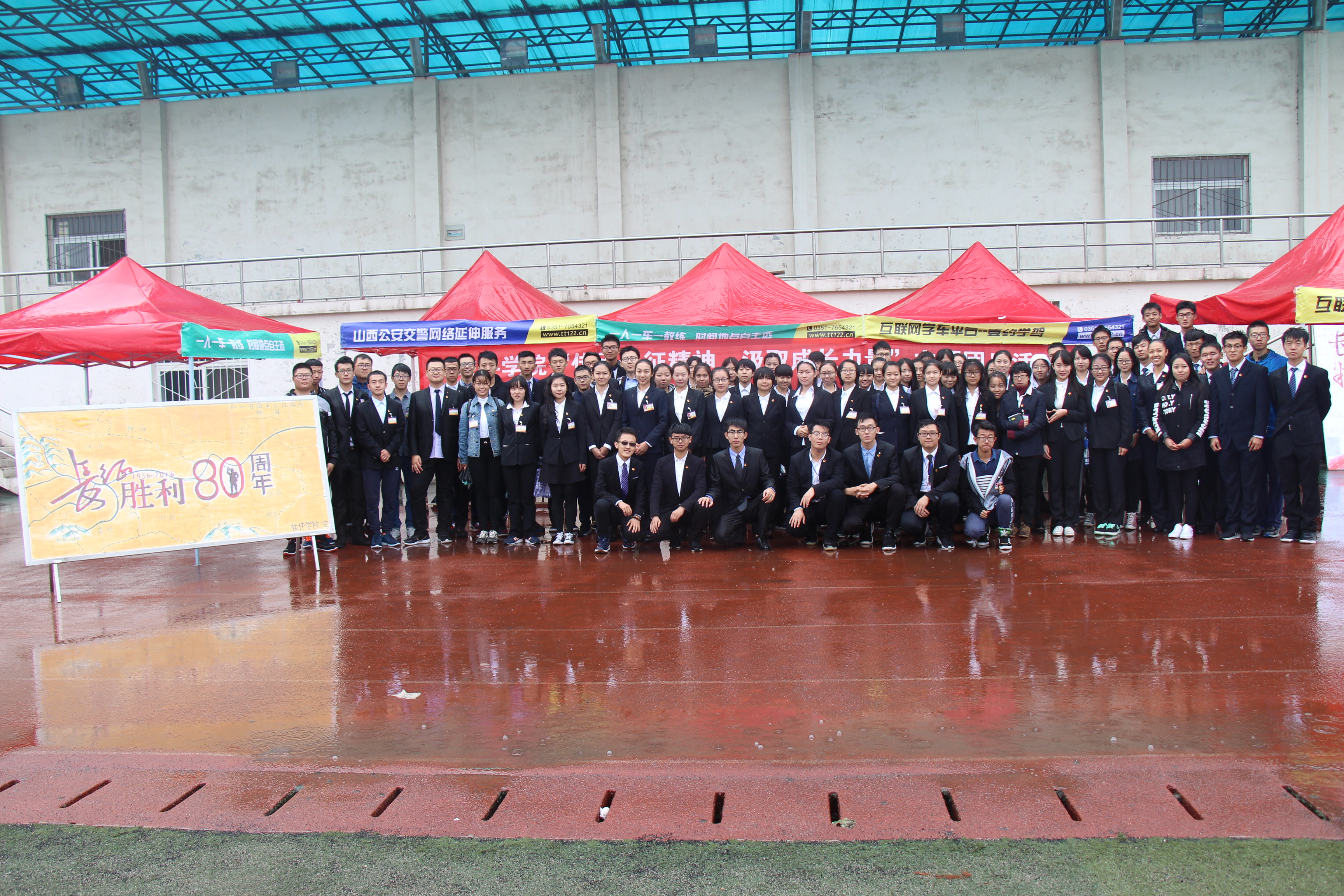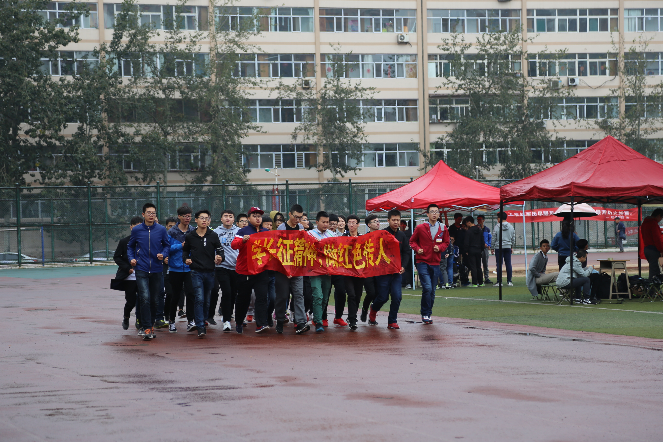 室内团日活动通过图片、音频、视频等媒介,以趣味问答、诗歌朗诵、互动游戏等方式将伟大的长征历程呈现给大家。室外团日活动于10月15日上午于同泽操场和训练馆两地举行:有的班级高唱红歌,唱响了当年红军的英勇豪迈和现在学生的青春热血;有的班级表演了长征小话剧,再现了当年红军爬雪山过草地的艰难困苦的环境;还有的班级进行了联谊,拔河、接力、绑腿跑等等,增强了班级凝聚力,增进了同学间的感情。即使活动过程伴随凉丝丝的秋雨,也丝毫没有浇灭同学们的热情。