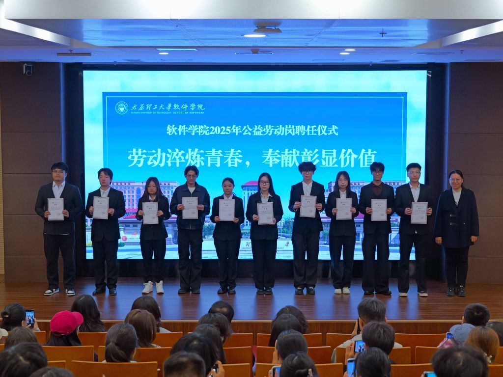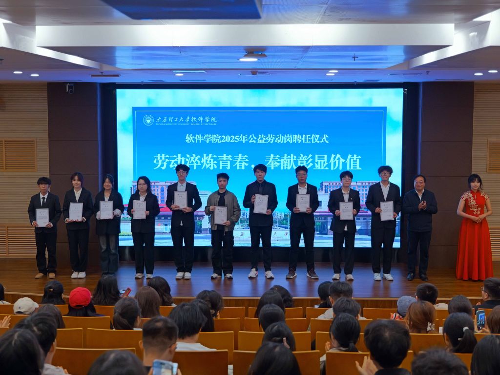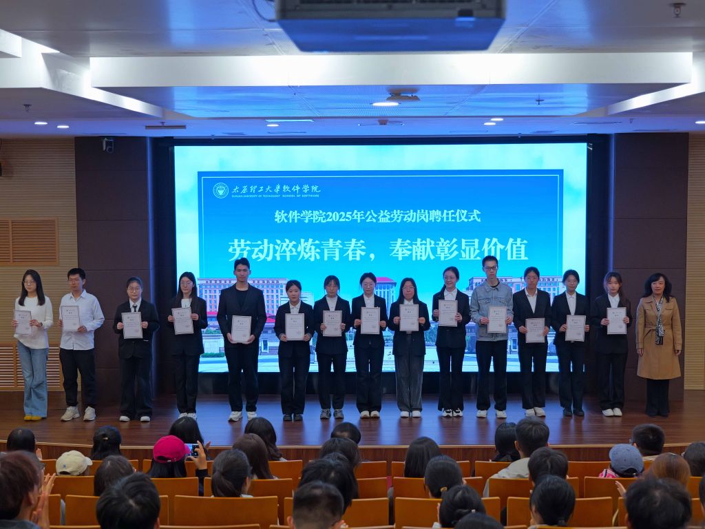 赵涓涓宣读公益劳动岗聘任决定。在热烈的掌声中,与会领导共同为受聘学生代表颁发了聘书。