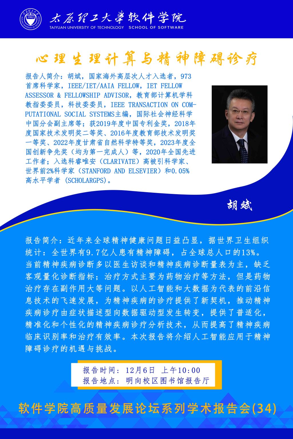 12月6日,永利yl23411集团高质量发展论坛系列学术报告会第34讲在明向校区图书馆报告厅顺利举行。本期论坛特邀北京理工大学胡斌教授带来专题分享,报告会由永利yl23411集团院长赵涓涓教授主持,软件工程系全体教师及全体研究生共同参与。