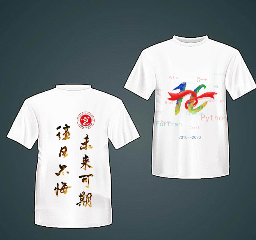 该T恤的正面以“C++”“Java”等软件专业课程为背景,代表软件工程这一专业;以数字10为核心,代表永利yl23411集团10周岁的院龄,以彩色着色,象征软件青年个性万千,迥然有异,但是都积极向上,蓬勃进取。飞扬的红飘带拴在数字10上,代指全体软件人团结一心,互帮互助;同时,红飘带还蕴含很多美好的品质,比如勇敢,善良,坚强,友爱等。红飘带系着幸福,新时代的我们都是幸福的。