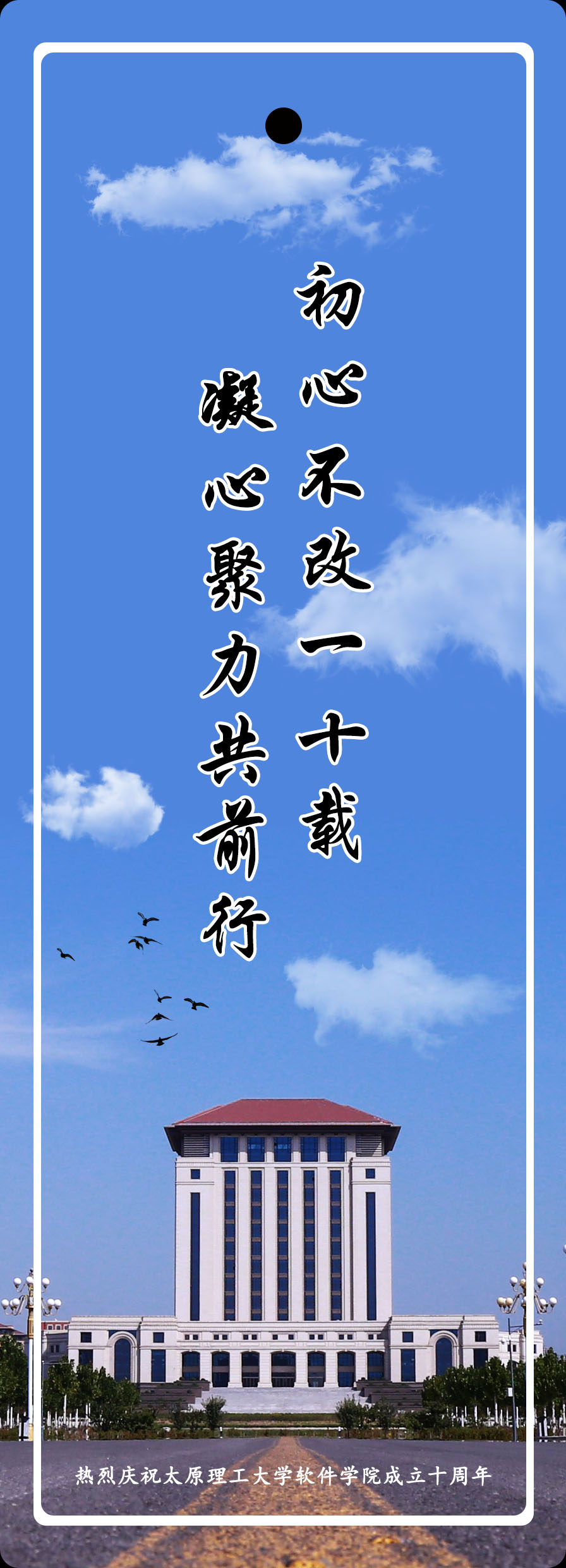 为庆祝永利yl23411集团成立十周年,我们以创意书签的方式为学院表示祝贺,表达永利yl23411集团师生在这十年之中“初心不改一十载,凝心聚力共前行”。