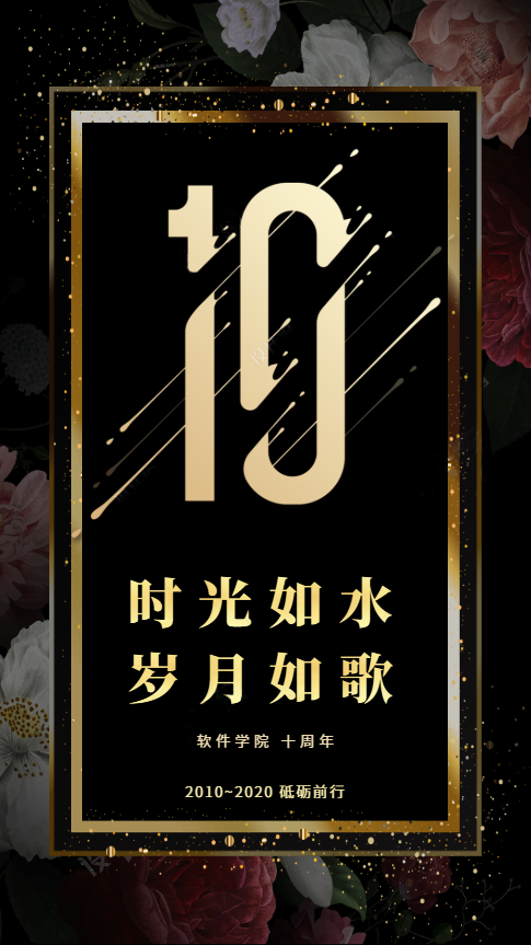 最大的“10”凸显软件十周年;“时光如水岁月如歌”表示十年岁月流逝,富有纪念感;其他文字进一步详解;修饰元素营造了高贵隆重感。寓意着永利yl23411集团闪闪发光的过往岁月,热烈庆祝十周年庆典,并表明软件人对未来充满信心。
