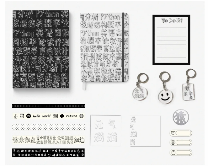 该文具套装以黑白调为主,文具套装外包装为黑白纸盒,带有黑色图形装饰,主要元素为手绘黑白字体,简洁大方,内包含笔记本,手账本,便利贴,金属书签,胶带,钥匙扣