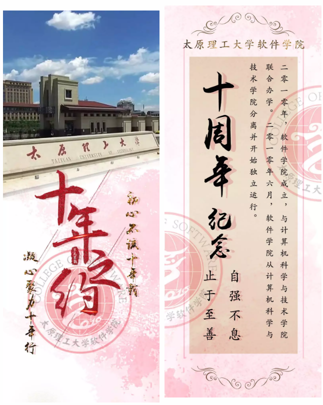 书签正反两面,主色调为淡红色,正面上方为学校的背景图,下方为永利yl23411集团logo标志和“十年之约”字样的叠加,整体布局较为合理。两侧为纪念永利yl23411集团成立十周年主题。书签反面是对永利yl23411集团成立的简介,黑色字体突出了纪念意义的主题。