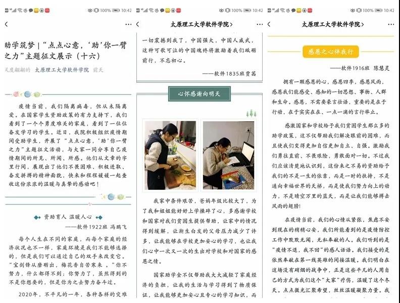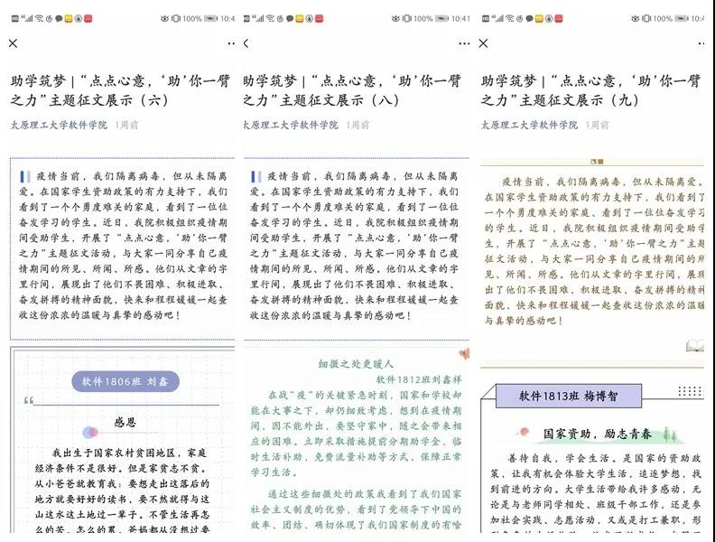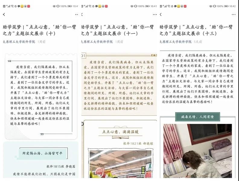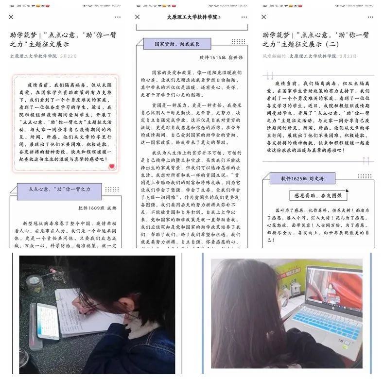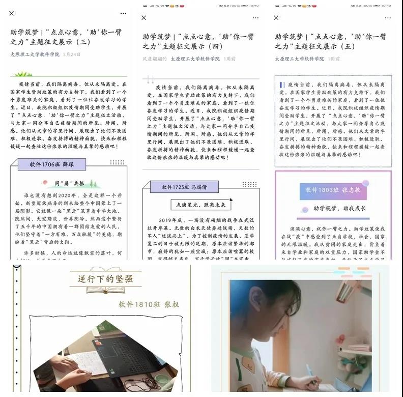 通过此次主题征文活动,我们看到了在国家学生资助政策的有力支持下,一个个勇渡难关的家庭所承载的希望,一位位奋发学习的青年所具有的魄力。停课不停学,温情永相随,软件学子将满怀着爱心助学的温暖,不断前进!