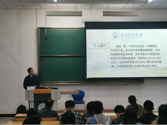 接着,软件工程专业脑电网络研究方向的2018级硕士郝琰同学上台宣讲,他从个人介绍、研究经历、成果介绍、全面发展、成长感悟五个方面介绍了他三年来的研究生生活与经历。幽默的语言与真挚的表达珠辉玉映,深深地打动每位听众。从他的话语中可以感受到科研的不易,但仍迎着困难,坚持的走下去。这样坚持不懈,勇于克服困难的品质值得我们每个人学习。