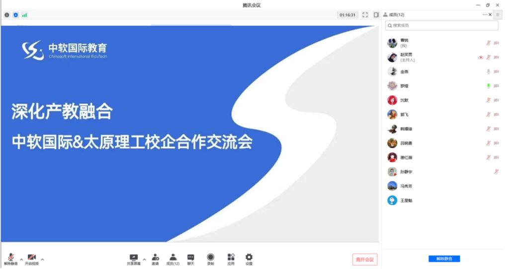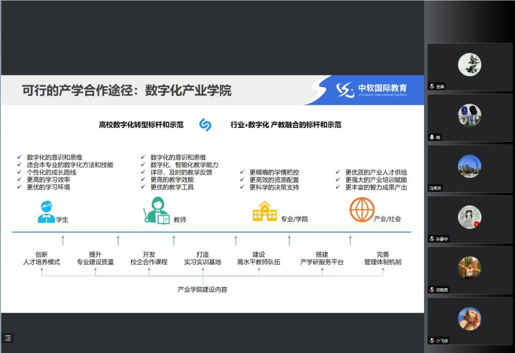 2022年4月13日,永利yl23411集团与中软国际教育集团召开校企合作交流会,由于受到疫情的影响,会议通过腾讯会议在线上召开。中软国际教育集团副总裁、产学业务线总经理罗娅、教学主管韩耀锋,永利yl23411集团院长金燕、党委副书记吕晓勇、副院长冯秀芳、副院长曹锐,以及系部负责人参加了本次交流会。
