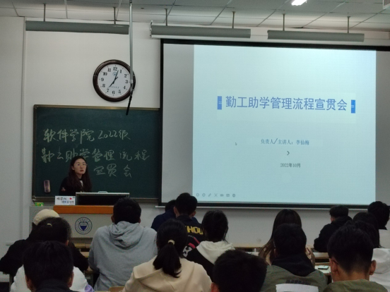 本次宣贯会上,李仙梅老师主要从勤工助学的概念、勤工助学的意义、勤工助学的岗位类型、报岗的注意事项及流程、报名和推荐原则五个方面向同学们介绍了学校勤工助学的细则。首先李仙梅老师向同学们介绍了学校开展勤工助学的意义,希望家庭经济困难的同学能在不影响自己学习的前提下积极参加。勤工助学的意义在于锻炼同学们的意志,克服懒惰,培养责任心,提早了解工作情况;还能让部分家庭经济困难的同学缓解生活消费压力;对于后续贫困生的认定和申请国家励志奖学金、国家助学金等资助奖励有着很重要的作用。