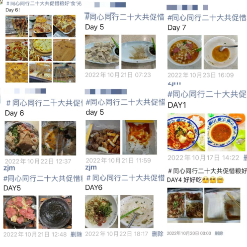 “一粥一饭当思来处不易,半丝半缕恒念物力维艰。”知粮在心,而惜粮在行,为了真正落实“珍惜粮食,杜绝浪费”的理念,本次活动的第二阶段设立了光盘打卡活动。参与者需完成当日任意一餐餐前、餐后不重复“光盘”照片的打卡,附带话题“同心同行二十大,共促惜粮好‘食’光”,发送在至朋友圈即视为打卡成功。通过为期一周的打卡活动,充分体现了同学们对落实“珍惜粮食,杜绝浪费”的理念的积极性。线上打卡人数为919人,其中868名同学打卡7次,占参与人数的88.7%,共计6333人次。参与活动的每一位同学都将“知粮在心,惜粮在行”的口号落到了实处,用实际行动展现了节约风范。