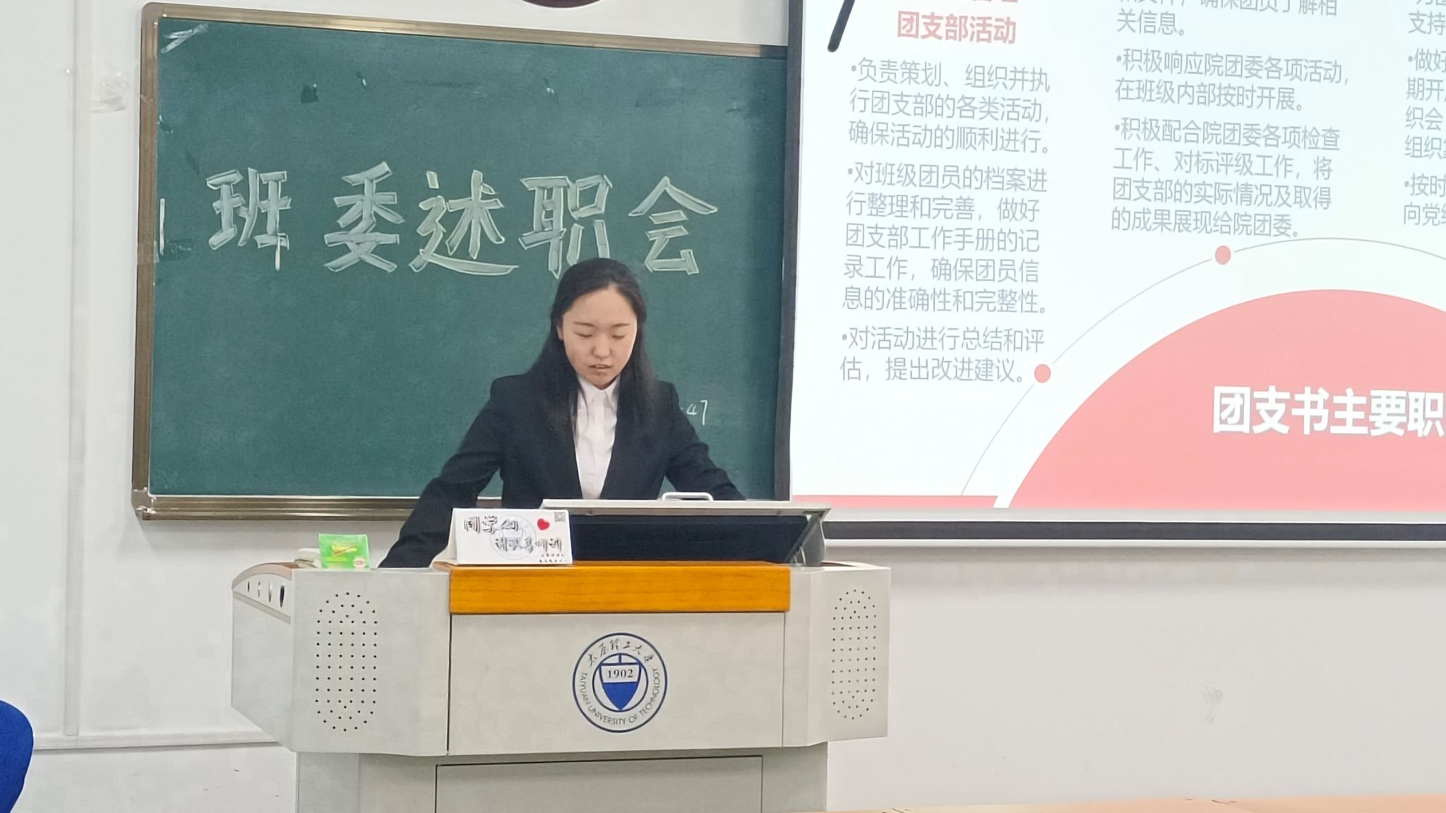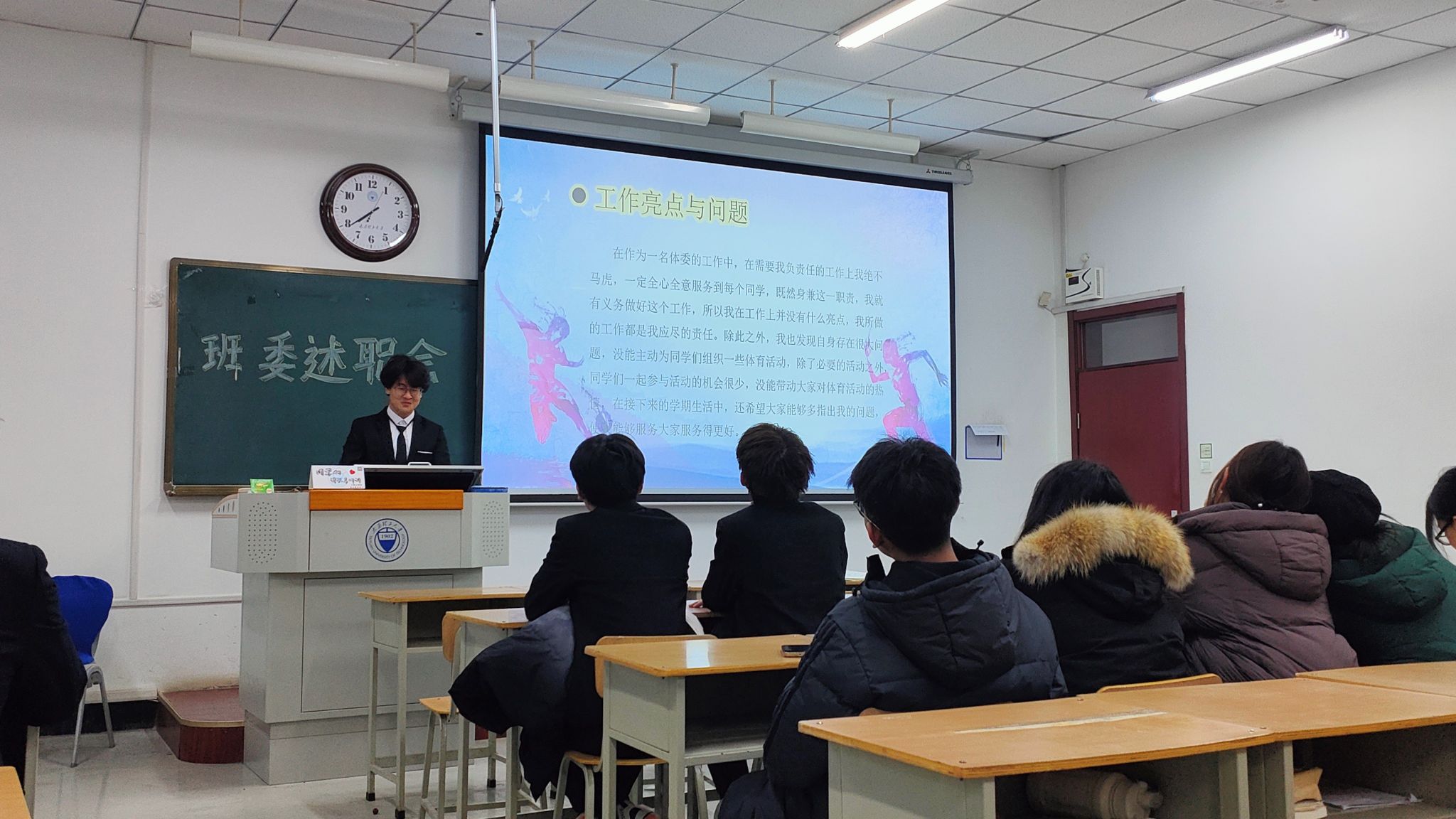 随后,各班利用课余时间自行开展班委述职评议工作,辅导员、班主任深入班级参加。班委们依托PPT,全面、客观、深入地就工作总结、工作亮点、工作反思、未来规划四方面展开述职汇报,全体同学本着认真负责的态度,对班委工作进行评议打分。辅导员、班主任就评议工作进行点评。