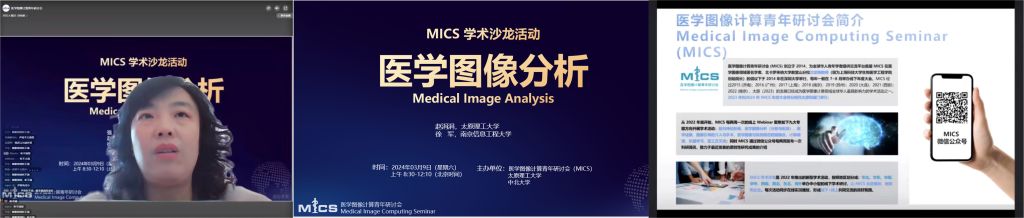 活动开始,赵涓涓院长首先就MICS(医学图像计算青年研讨会)的情况做了简单的介绍。MICS创立于2014,是为全球华人青年学者提供的交流平台,已经成为医学图像计算领域最具影响力的学术活动之一。MICS学术沙龙活动每两周一次在线上举办,聚焦九大专题:脑与神经影像、医学图像分析(分割与配准)、医学成像、图像引导的介入与手术、医学图像与其他模态数据融合、计算病理、机器学习、医工交叉等。