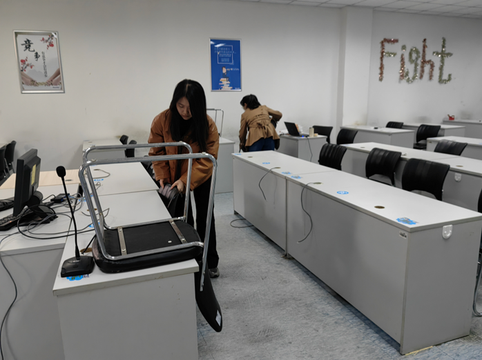 第一小组前往基地的202和204教室,负责教室内桌椅板凳的归位、摆放与网线的梳理,这两个教室作为同学们日常自习、网课或者面试的场所,大家共同努力为考研的同学创造了一个良好的学习环境,为就业的同学创造一个良好的面试环境。