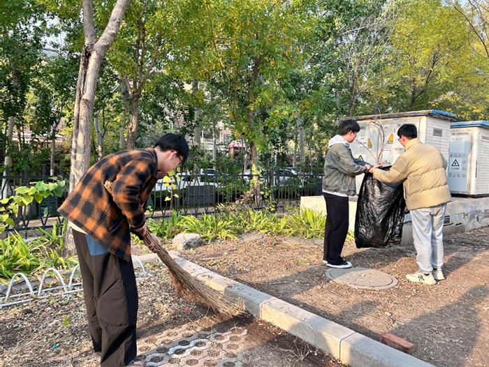 第三小组前往基地院内的每个角落去清理落叶,美化环境。秋日的寒意氤氲在空气中,但是面对着落叶和掉落的树枝,同学们积极主动,有的负责清扫,有的负责把落叶集中装在口袋里,为同学提供了整洁的基地环境。