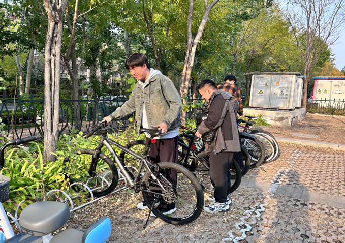 第二小组前往基地院内的自行车、电动车摆放区,由于大家平日学习的匆忙,基地部分骑车的同学对自行车、电动车的摆放不够整齐,党员同志们以身作则,主动负责将车位规整,给其他同学做好榜样,积极营造一个整洁的停放区。