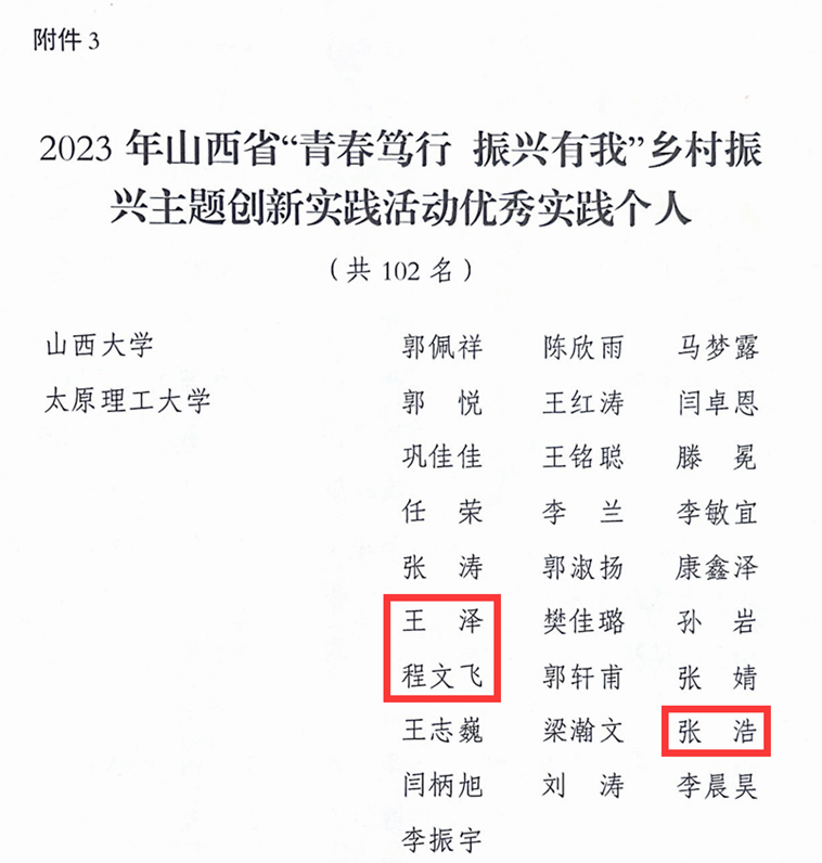 近日,共青团山西省委发布《关于表扬2023年山西省“青春笃行 振兴有我”乡村振兴主题创新实践活动中表现突出的集体和个人的通报》,我院赴应县下马峪乡社会实践队荣获优秀实践团队荣誉称号,王泽、程文飞和张浩荣获优秀实践个人荣誉称号。